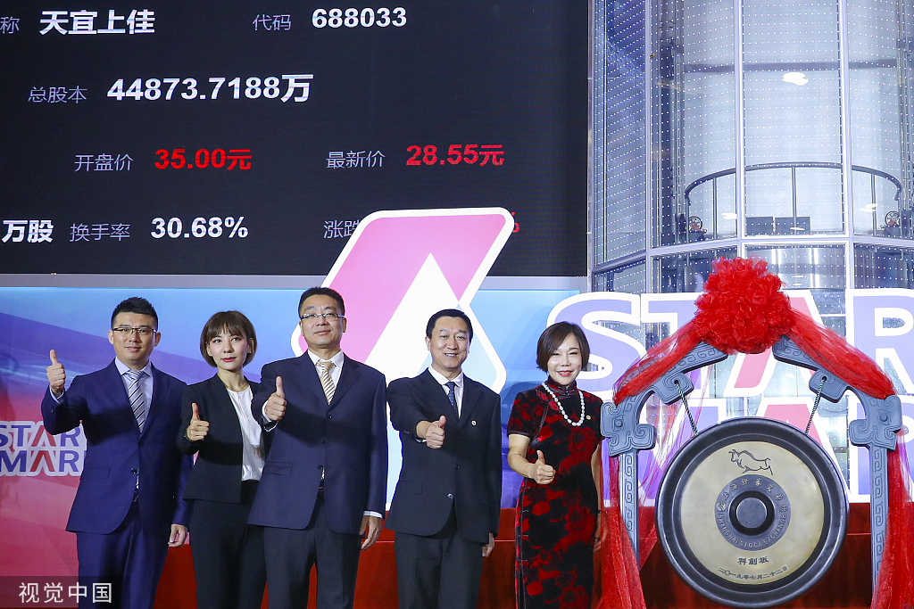 2019年7月22日,上海證券交易所內(nèi),北京天宜上佳高新材料股份有限公司董事長吳佩芳(右一)出席科創(chuàng)板開板儀式。